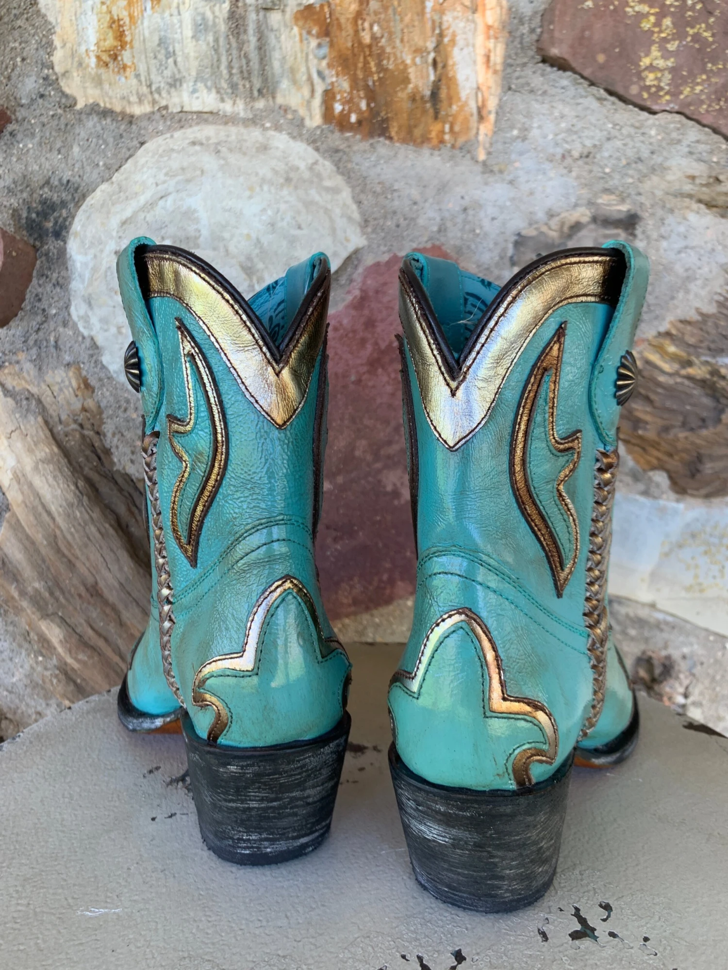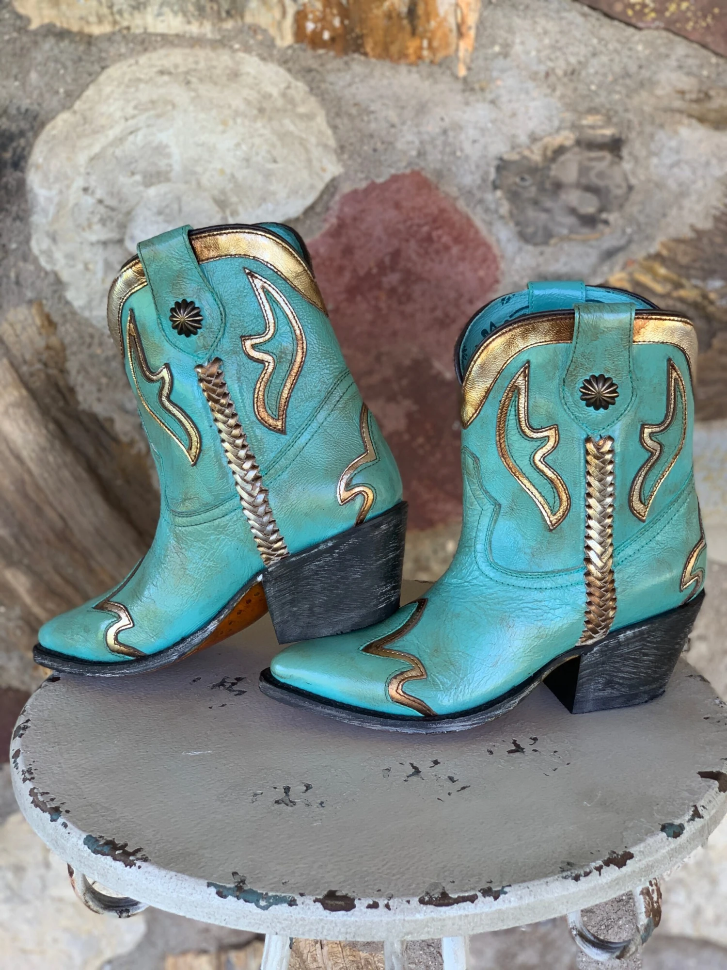 Have you ever seen a bootie this perfect?!? These boots give us major Miranda Lambert vibes! They are turquoise with an antique wash and gold metallic accent designs. The braid down both sides is the icing on the cake!!!Β