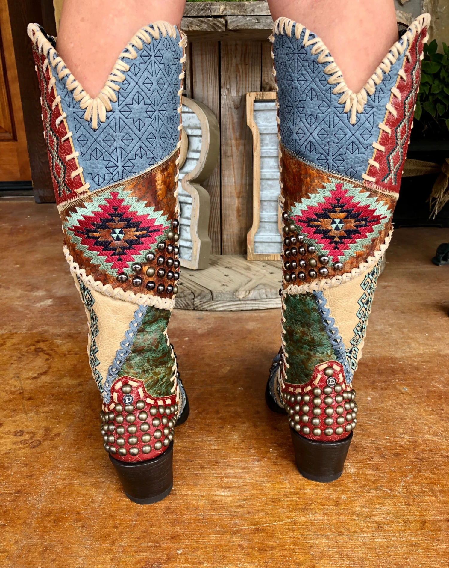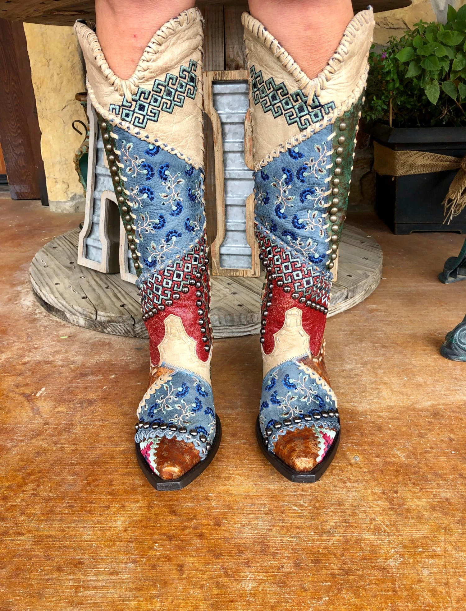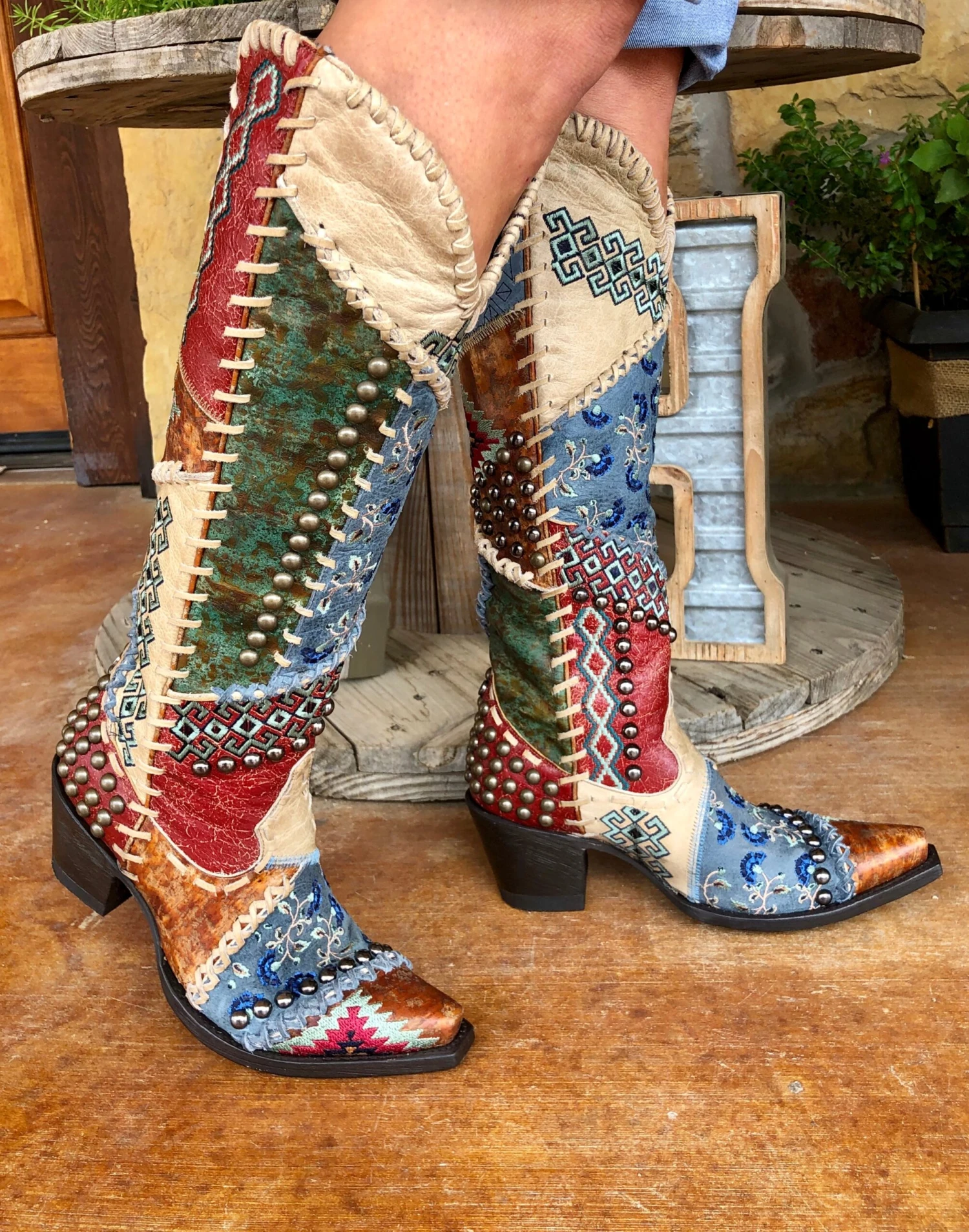 I have no words for this Amazing Boot!!!ย This patchwork beauty is accented with silver and gold brads with some whip stitching.ย