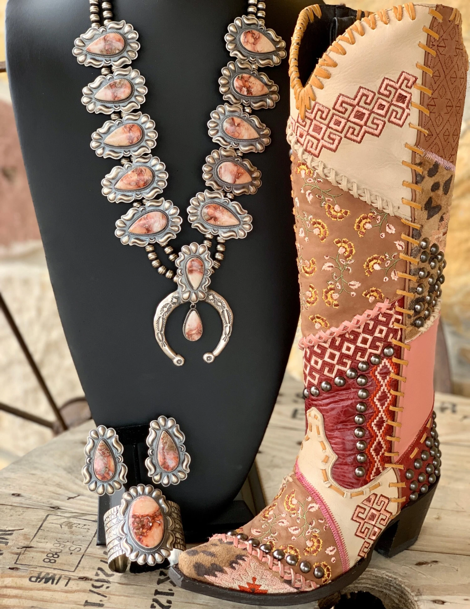 •We took 12 exquisite Red Jasper stones and surrounded them with one-of-a-kind sterling silver designs to create this stunning squash necklace. Squash measures 17.5” inches from tip of Naja to top Navajo Pearl.
